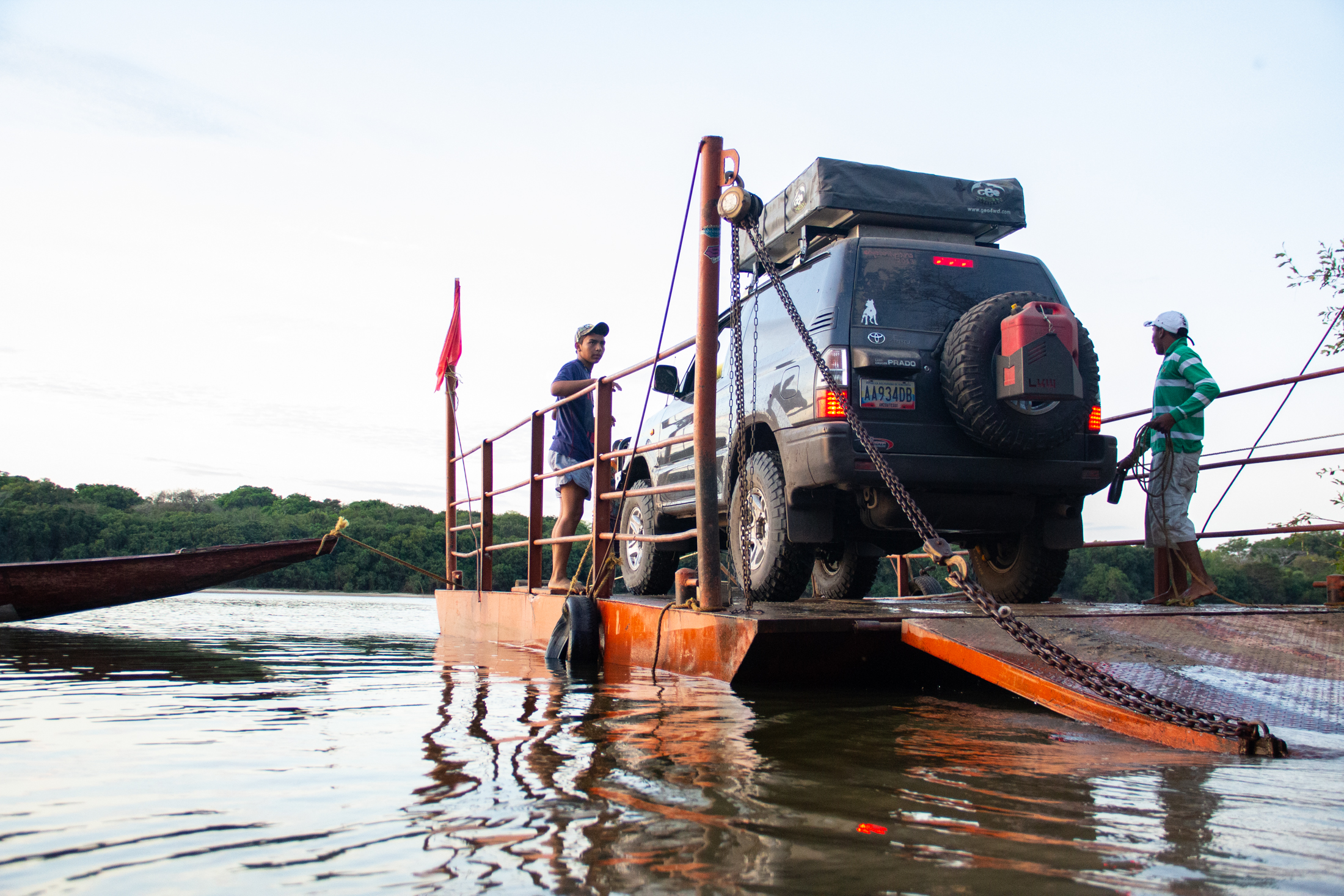 El cruce del río sobre la chalana fue una experiencia algo interesante, y no puedo negar que la primera vez da un poco de miedo por lo que pueda ocurrir. La chalana consiste en una plancha de metal flotante de aproximadamente unos 8 metros de largo y 2 metros y medio de ancho, en la cual caben dos carros exactamente, con barandas a ambos lados y propulsada por una curiara con motor fuera de borda. Esta a su vez es guiada por una cuerda que se encuentra atada en ambas orillas del río. Al montar el primer carro la chalana es bastante inestable y es necesario apoyar el segundo carro sobre esta, mientras el primero se desplaza hacia delante con el fin de que no se incline demasiado y evitar que el primer carro caiga al agua por la proa. Una vez montados los vehículos la navegación es bastante agradable y se disfruta enormemente.