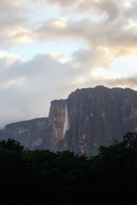 Abro los ojos por la bulla de las personas del campamento y lo primero que veo es el Salto Ángel completamente despejado con un cielo azul intenso de fondo. Me levanto rápidamente para tomar fotos. ¡Jamás había visto, en fotos, una vista tan bella de este! Qué afortunados fuimos, debido a que por lo general está nublado, o con bruma.