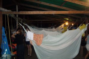 Como anécdota graciosa les puedo comentar que a eso de las 3 a.m. me despertaron unos ronquidos del más allá que venían de por lo menos 15 hamacas más abajo. Era un extranjero, que más que persona parecía una bestia, que con cada ronquido despertaba a más y más personas. Mi Papá, que estaba durmiendo a mi lado en una de esas se despierta, se sienta en la hamaca y de la nada pega un grito diciendo en inglés: